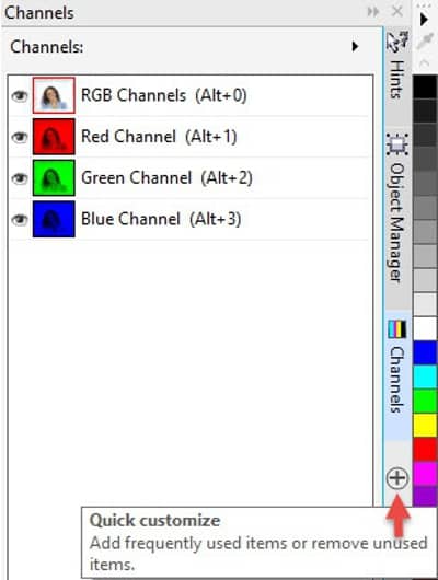 Because I won't be using the Channels Docker anymore, I turn it off via the Quick Customizing button on the Dockers panel.
