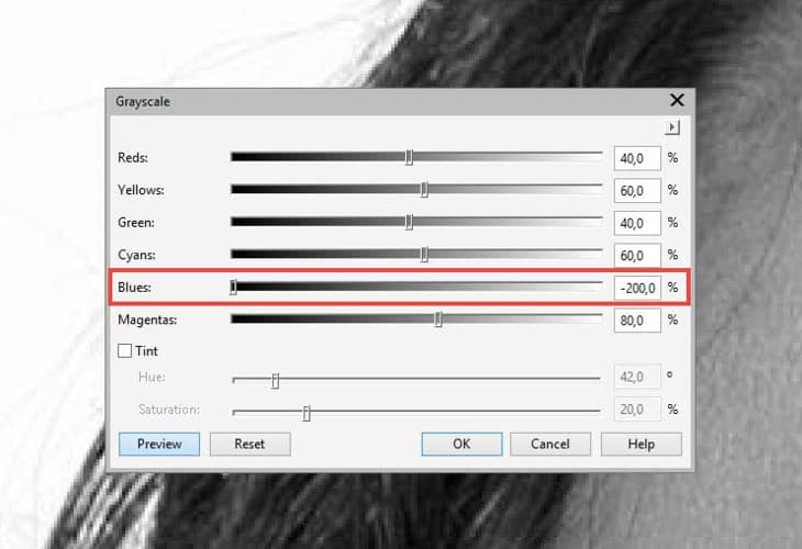 What I don't want to do is to destroy the finest strands of hair therefore I move the sliders slowly, setting the values of the sliders as dark as possible until I reach the point just before they start to destroy the details of the hair. It won't make it fully black, but the contrast will make it darker.