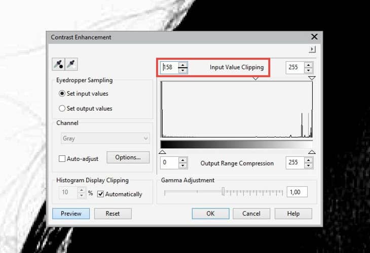 When this is done, I use the Contrast Enhancement Lens Object (Object > Create > New Lens > Contrast Enhancement), equally gently, dragging the sliders to make the image darker and always keeping an eye on the finer hair details – make sure you leave this intact. For this particular image I managed to drag the Input Value Clipping on the left to about 158. And clicked OK.