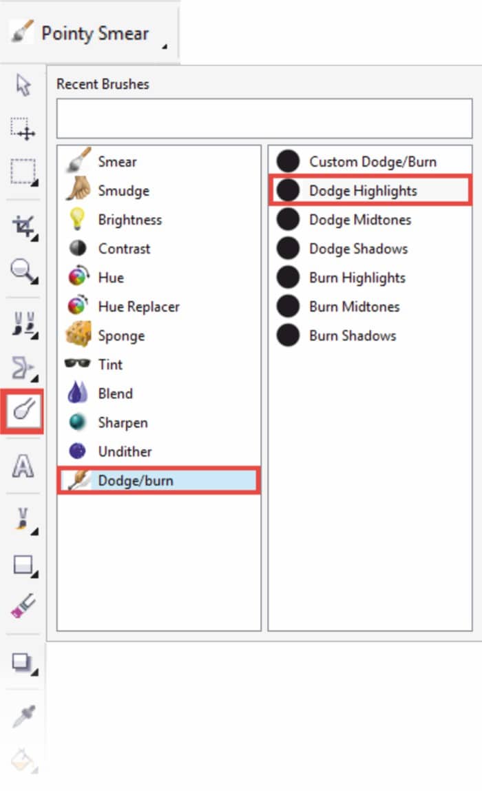 In the Toolbox I choose the Effect Tool > Brush Selector Category > Dodge and Burn, and start with Dodge > Dodge Highlights.