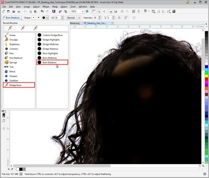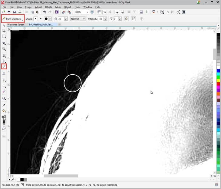 It is better to paint the Burn Shadow on top of itself in multiple strokes on the sensitive areas, and that way work yourself forward to a great silhouette. It's otherwise easy to damage the fine areas, such as the hair. Simply put: don't stress it. Be gentle and it will give you the best results.