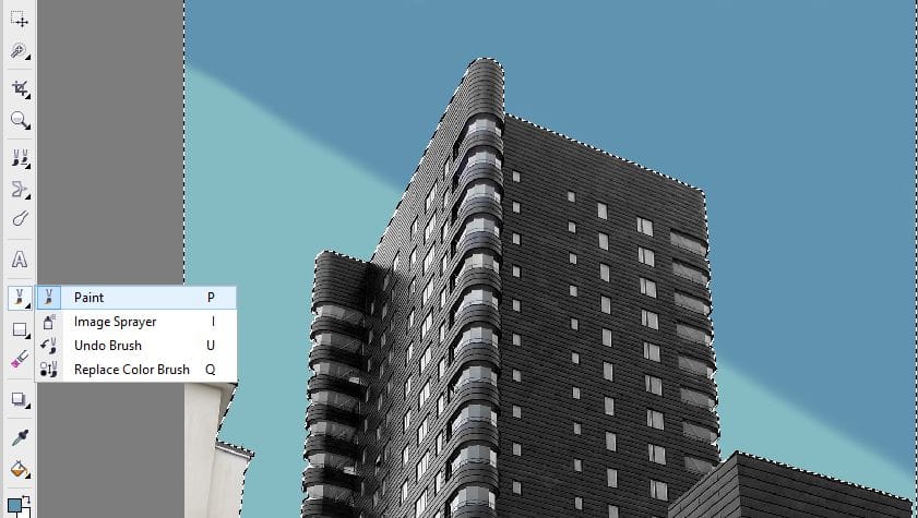 I deselected the mask tool (Mask > Remove or CTRL+R), and looked closer at the edges of the mask - in this case the blue - and painted more blue color with the Paint tool, using a soft nib where it was needed, especially around the balconies here and there. Basically touching up with blue so that no white was shining through.
