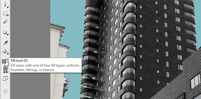 I created a new object in the Objects Manager Docker by clicking on the New Object icon in the bottom left corner of the docker. With Mask still active, I used the Fill tool from the Toolbox to fill the selection of the sky with the brighter blue color. (To change the fill color, double-click on the Fill icon at the bottom of the Toolbox. In the Edit Fill window, grab the Eyedropper tool and pick up the lighter blue from the Document Palette. Or you can also just drag the lighter blue from the default Color Palette over to the Fill icon).