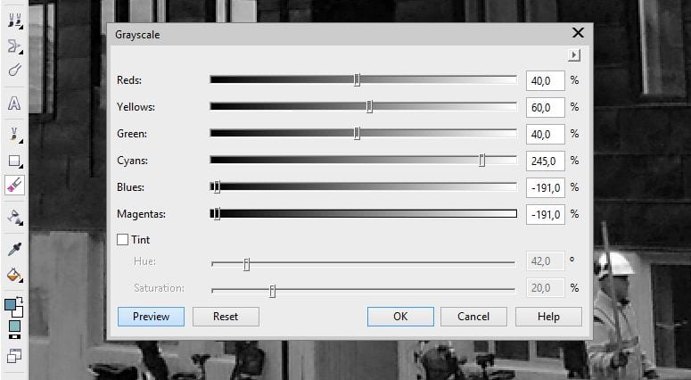 In the Object Manager Docker I picked a Grayscale Lens Object by clicking on the New Lens icon at the bottom left of the docker (or Object > Create > New Lens). I dragged the slider handles to give the facade of the building a darker tone. Basically, more black.