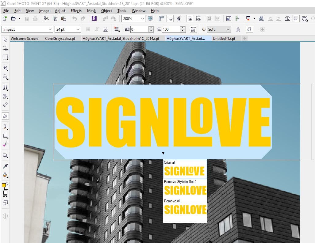 Because the sign on the wall was a text object, I used the Open Type features in Corel PHOTO-PAINT X7. You can quickly find the open type font features available within a certain font by clicking the black little arrow that appears when the text is selected. This will open up a drop-down list that shows the alternative style sets.